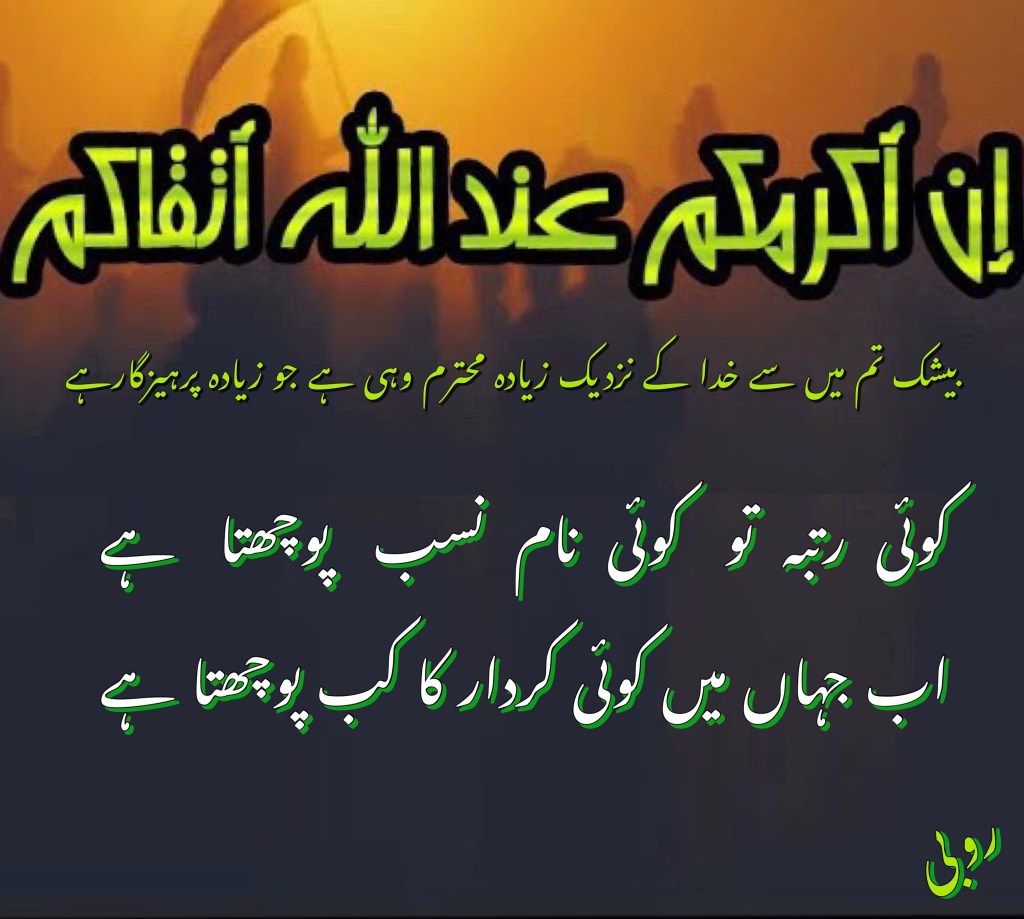 “اے انسانوں ہم نے تم کو ایک مرد اور ایک عورت سے پیدا کیا ہے اور پھر تم میں شاخیں اور قبیلے قرار دیئے ہیں تاکہ آپس میں ایک دوسرے کو پہچان سکو بیشک تم میں سے اللّٰہ کے نزدیک زیادہ محترم وہی ہے جو زیادہ پرہیزگارہے اور اللہ ہر شے کا جاننے والا اور ہر بات سے باخبر ہے۔”