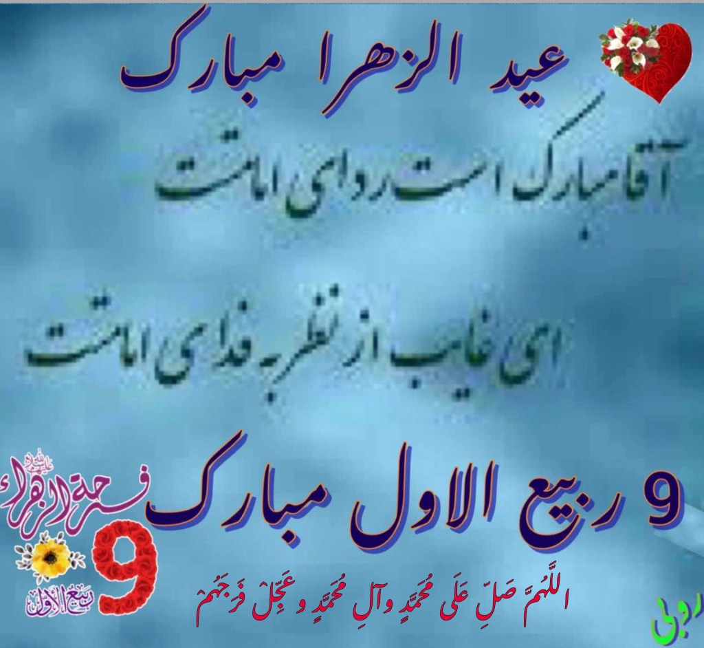 تمام مومنین و مومنات مسلم و مسلمات کو عید زھرا سلام اللّٰہ علیہ، امام زمانہ عج کی امامت کا پہلا دن بہت بہت مبارک ہو۔ خصوصاً امامِ زمانہ علیہ السلام کی خدمت میں ھدیہِ تبریک پیش کرتے ہیں