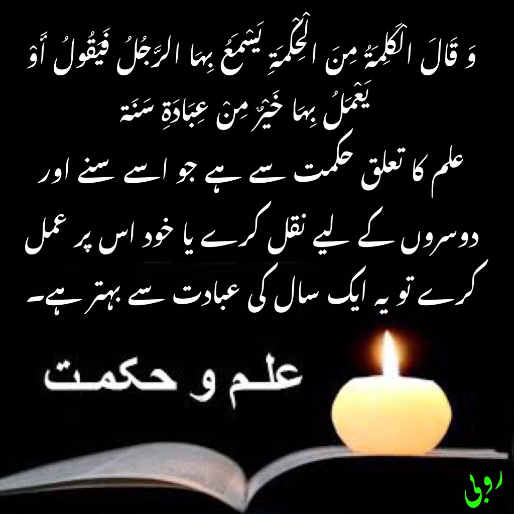 علم کا تعلق حکمت سے ہے جو اسے سنے اور دوسروں کے لیے نقل کرے یا خود اس پر عمل کرے تو یہ ایک سال کی عبادت سے بہتر ہے۔