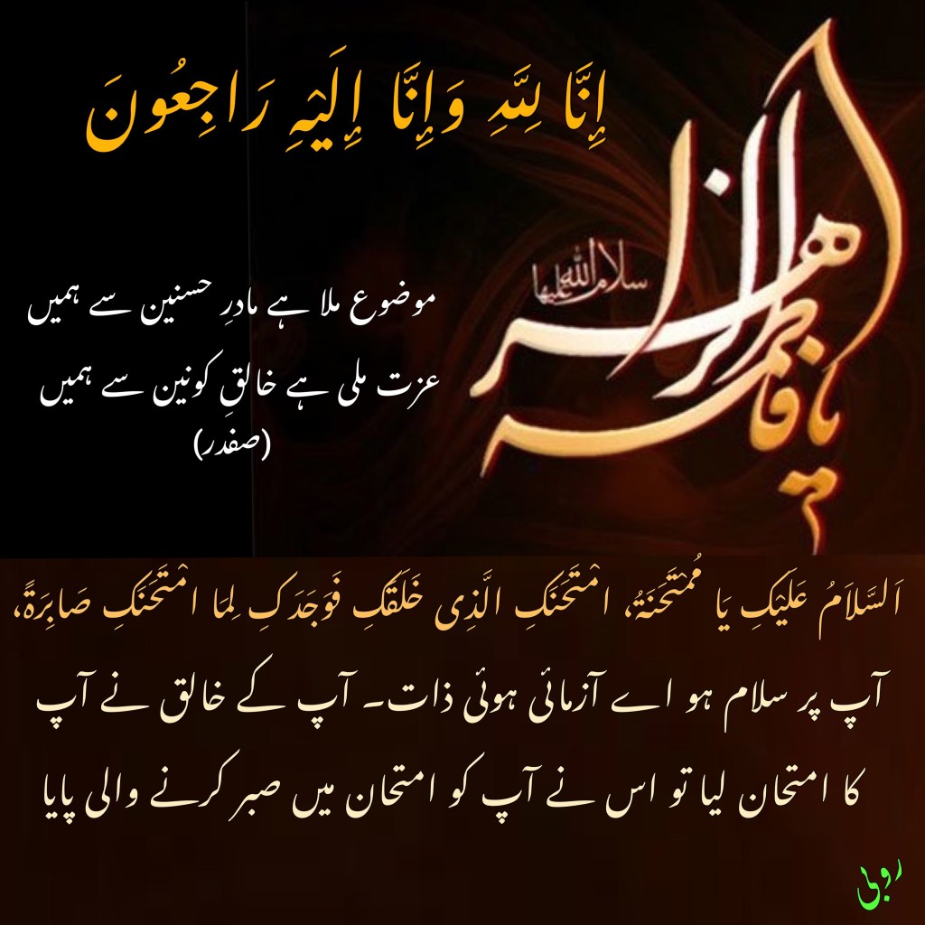 ایام فاطمیہ بی بی سیدہ و طاہرہ و معصومہ و مظلومہ فاطمہ زہرا صلوات اللّٰہ علیہ کی شہادت کے موقع پر ہم اور ہماری فیملی، رسول اللّٰہ، خانوادہ رسول ع اور خصوصاً وقت کے امام۔ امام زماں عج کی خدمت میں اور تمام مومنین و مومنات و مسلمین و مسلمات کو تعزیت پیش کرتے ہیں