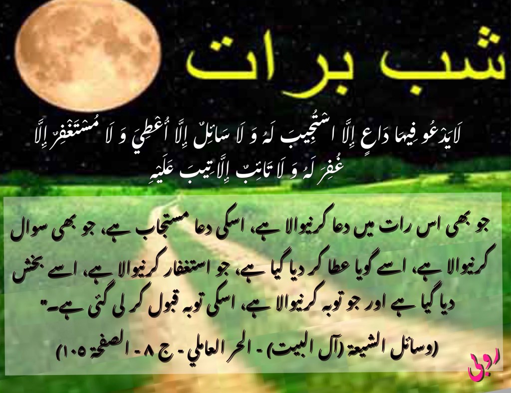 شب نیمہ شعبان، شب برات اللّٰہ تعالی کے الطاف خاص میں سے ایک لطف ہے۔ اس رات کی عظمت کے بارے میں اتنا ہی کافی ہے کہ جبرائیل نے اللّٰہ تعالی کی طرف سے پیغمبراکرم کو یہ پیغام سنایا کہ اللّٰہ آپ حکم دیتا ہے کہ اس رات کو بیدار رہیں اور اپنی امت کو بھی اس رات بیدار رہنے کی وصیت کریں تاکہ اس رات عبادت کے زریعہ اللّٰہ کا قرب حاصل کریں۔ اس کے بعد فرمایا کہ آج رات وہ رات ہے کہ: