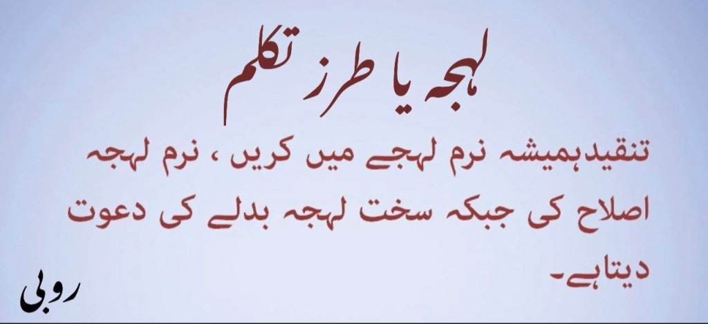 روزمرہ کی زندگی میں زیادہ تر جھگڑے غلط لہجے کی وجہ سے ہوتے ہیں، ہمیں کوشش کرنا چاہئے کہ خوبصورتی سے بولیں یا خاموش رہیں. اپنے لہجے میں نرمی لانے کی کوشش کریں، نرمی سے کی گئی بات اثر بھی رکھتی ہے اور لوگوں کے دلوں میں ہمارا مقام بھی بڑھاتی ہے جبکہ سخت لہجے میں کی گئی بات دوسرے کی انا کو بھی جگا سکتی ہے اور معاملہ الٹ بھی ہوجاتا ہے