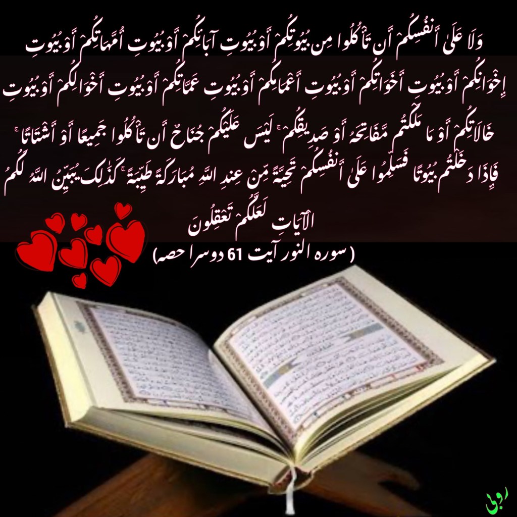 ترجمہ: اور نہ خود تم پر اس بات میں کوئی حرج ہے کہ تم اپنے گھروں سے کھاؤ یا اپنے باپ (اولاد کا گھر بھی باپ کا گھر ہوا) کے گھروں سے یا اپنی بڑی ماؤں (نانی دادی) کے گھروں سے یا اپنے بھائیوں کے گھروں سے یا اپنی بہنوں کے گھروں سے یا اپنے چچاؤں کے گھروں سے یا اپنی پھوپھیوں کے گھروں سے یا اپنے ماموؤں کے گھروں سے یا اپنی خالاؤں کے گھروں سے یا ان کے گھروں سے جن گھروں کی چابیاں تمہارے اختیار میں ہوں یا اپنے دوستوں کے گھروں سے، اس میں بھی کوئی حرج نہیں کہ تم مل کر کھاؤ یا جدا جدا۔۔۔ اور جب تم کسی گھر میں داخل ہو تو اپنے آپ پر سلام کیا کرو اللّٰہ کی طرف سے بابرکت اور پاکیزہ تحیت کے طور پر، اس طرح اللّٰہ اپنی نشانیاں تمہارے لیے کھول کر بیان فرماتا ہے، شاید تم عقل سے کام لو۔